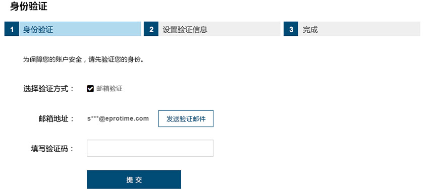 第三步:验证身份,选择验证方式(验证方式根据登录环境而定,分为身份验证、邮箱、手机、密保问题、密保卡)获取验证码,点击“下一步”;